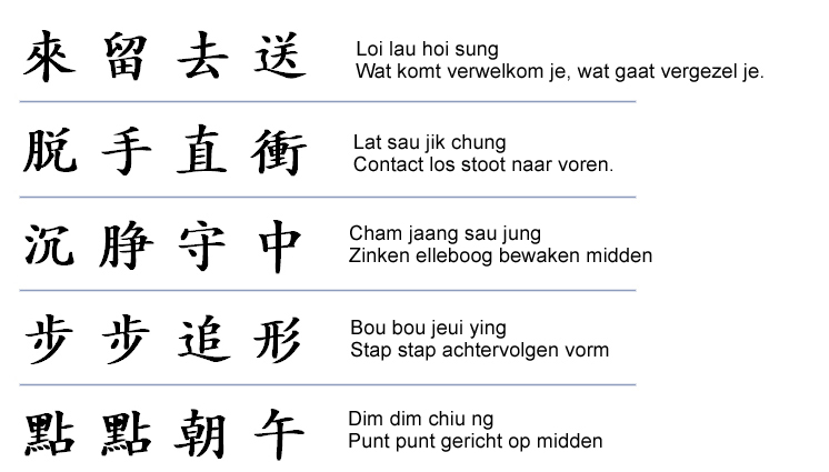 10 concepten: We gaan uit van een aantal richtlijnen of concepten. Wanneer concepten elkaar in de weg zitten is de oefening niet correct. Voorbeeld: ik heb een Bong Sau en mijn andere arm is laag ik stoot onder mijn Bong Sau door. Ik neem de kortste weg dat is een concept, maar ik kruis ook mijn armen en dat is tegen een concept in. Dus de oefening is niet goed, je moet je altijd aan alle concepten houden. Daarom is een goede oefening bedenken niet altijd even eenvoudig. Je wilt immers geen verkeerde gewoontes of reacties aanleren. Wong Sung Leung was overigens het meeste enthousiast over de eerste 2 principes van Ip man. Loi lau hoi sung & Lat sau Jik chung. Het enige moment dat je niet aan de concepten hoeft te houden is als je in een 3e vorm situatie zit, alleen dan zit je in een noodsituatie en moet je soms afwijken van de basisconcepten. 1ste Concept: Loi lau hoi sung. Stop/verwelkom wat komt. Vergezel wat gaat. Omschrijving: Je wacht de tegenstander op met zijn aanval. Als de tegenstander een stoot geeft hou je die tegen en je bent in contact. Dan als de tegenstander terugtrekt met die arm volg je die beweging.